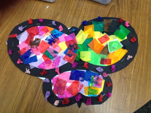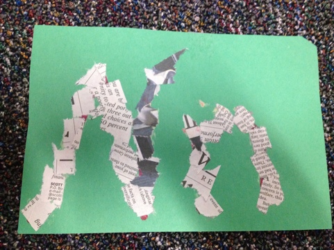 I had them draw their fish on white construction paper, cut it out, glue it to blue paper, then cut out pink sea anemone’s and green seaweed (using just scraps of paper).