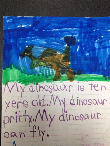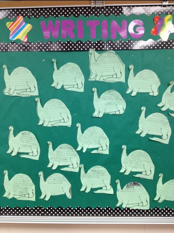 My favorite dinosaur sight word writing! As I modeled writing (while the students read aloud) I emphasized how each word is a sight word that we have learned during Kindergarten. All except for the word dinosaur.