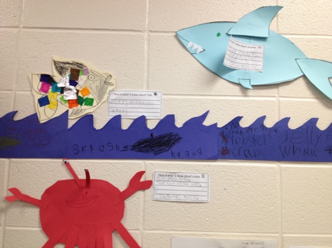 The crab, shark and fish were items the students made in learning stations, with the help of older students. The Stations lasted for an hour, with a fourth station being a jellyfish craft.