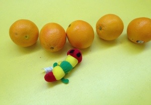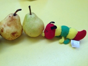 We just completed a fun “Hungry Caterpillar” activity, using real fruit and a caterpillar toy to retell Eric Carle’s story. My students also tasted each fruit, just as the caterpillar did!