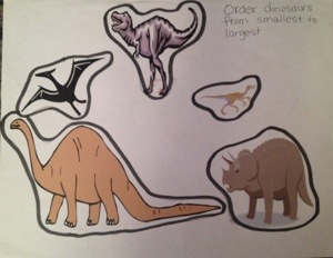 Whole Group Activity – Pass out Clip Art made dino-sticks of “meat-eaters” and “plant eaters.” The meat eaters act out “subtraction” problems that the teacher verbalizes and writes down on the whiteboard. The children absolutely love eating their dinosaur friends!