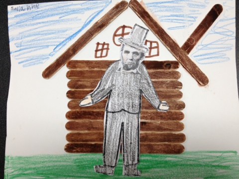 Here are the Log cabins that we made. First, the students colored small popsicle sticks with marker or crayons. I gave them small pieces of poster board for them to glue the sticks onto. Next, they colored simple clothing drawings, added a clip art image of Lincoln and glued a little hat drawing on top. Doesn’t it look like a bobble head?!?