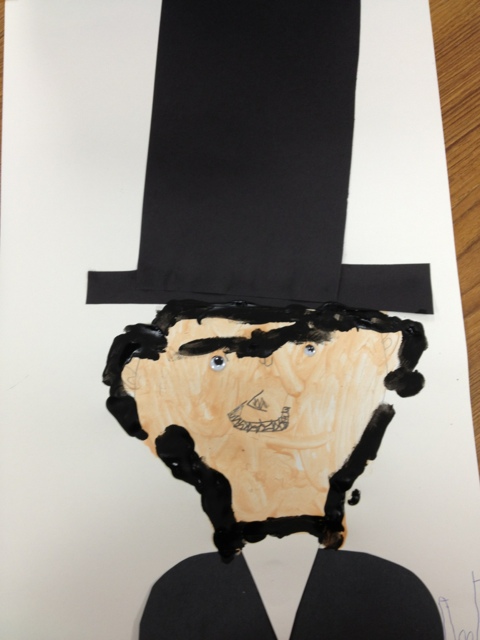 Abraham Lincoln Portraits – Step 1: Glue on the pre-cut black jacket then the white triangle shirt. Step 2: Draw a head and neck. Step 3: Use flesh colored paint to paint his face-let dry. Step 4: Draw eyes, nose, mouth, eyebrows. Step 5: Glue on a pre-cut rectangle hat and hat rim. Step 6: Finger paint (with your finger) his hair, beard and eyebrows.