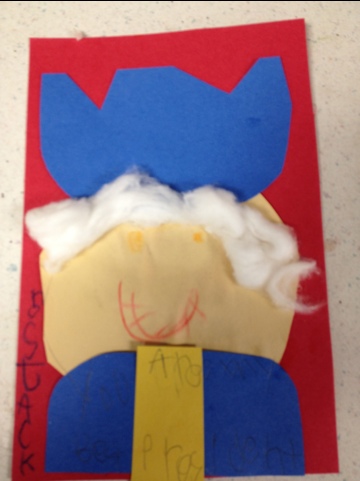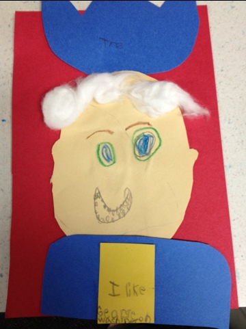 George Washington Portraits- The students drew a face on manila paper then cut it out and drew the face. I gave them pre-cut blue hats and jackets with a yellow square shirt. We learned that he was a general and we found a google image of him in his uniform. I cotton ball was used for the hair “wig.” The red paper is a half of a regular sized construction paper.