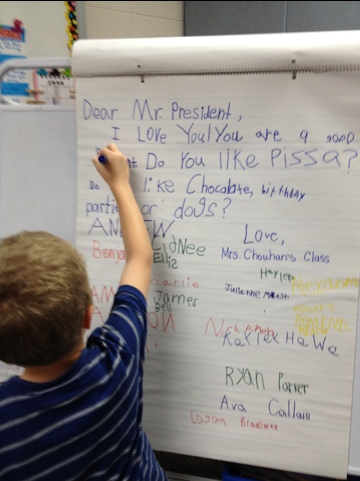 We wrote a letter to the president! Each word was written by a student and each one had a turn. This was a great lesson about “question” sentences!
